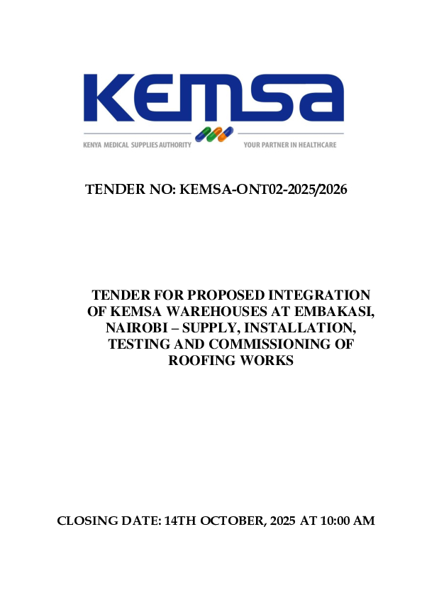 TENDER FOR PROPOSED INTEGRATION OF KEMSA WAREHOUSES AT EMBAKASI, NAIROBI – SUPPLY, INSTALLATION, TESTING AND COMMISSIONING OF ROOFING WORKS
